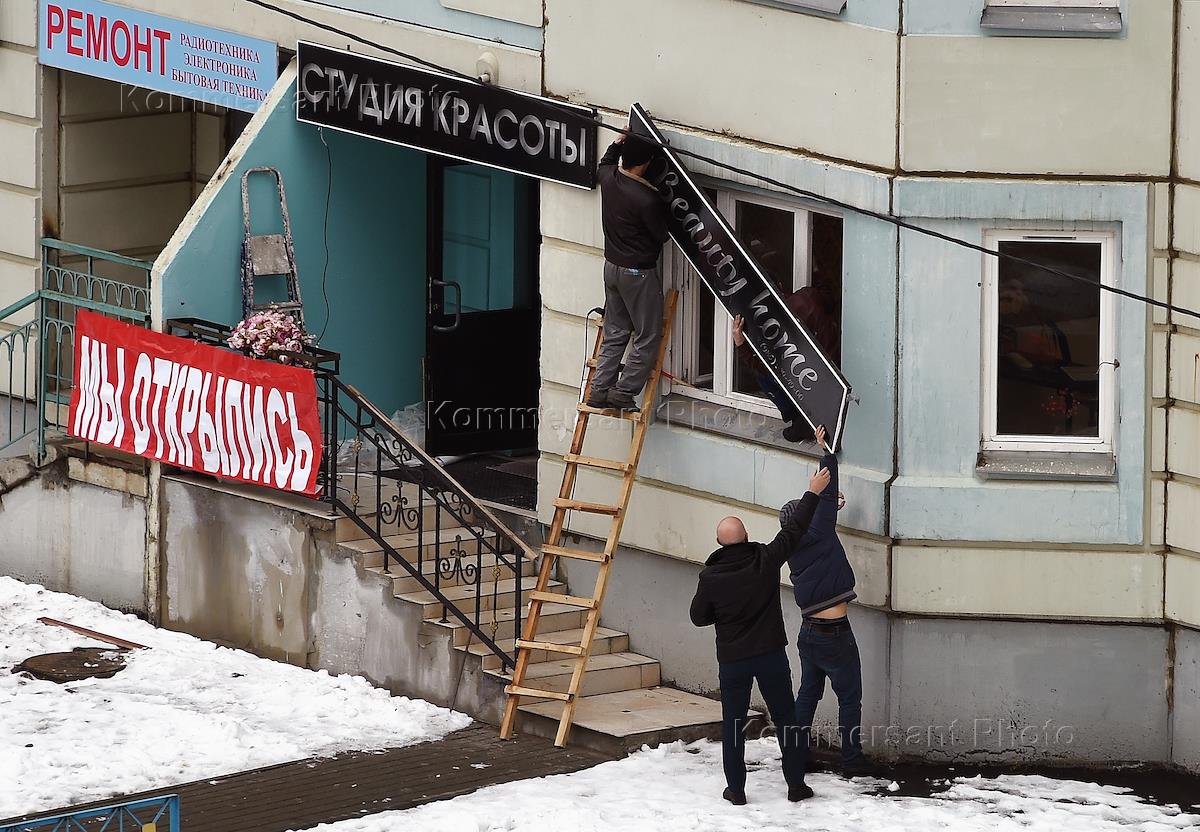 Жанровая фотография. Мужчины с вывеской салона красоты.