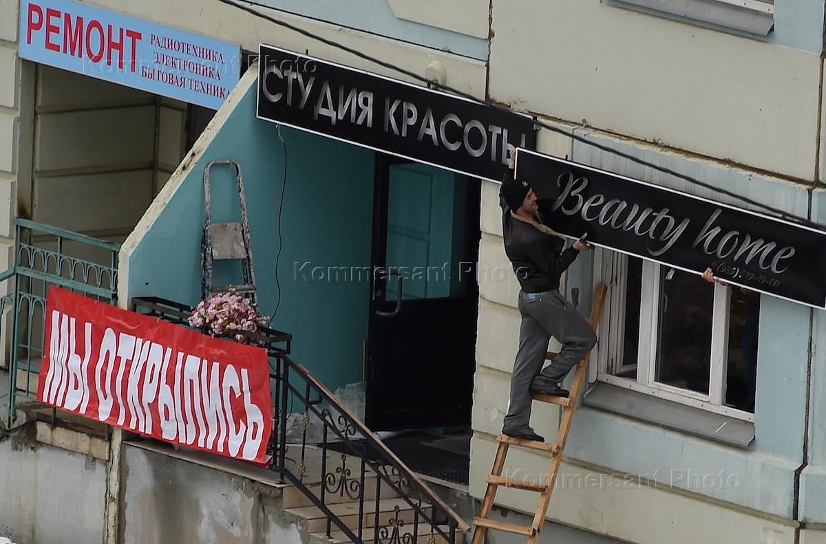 Жанровая фотография. Мужчина с вывеской салона красоты.