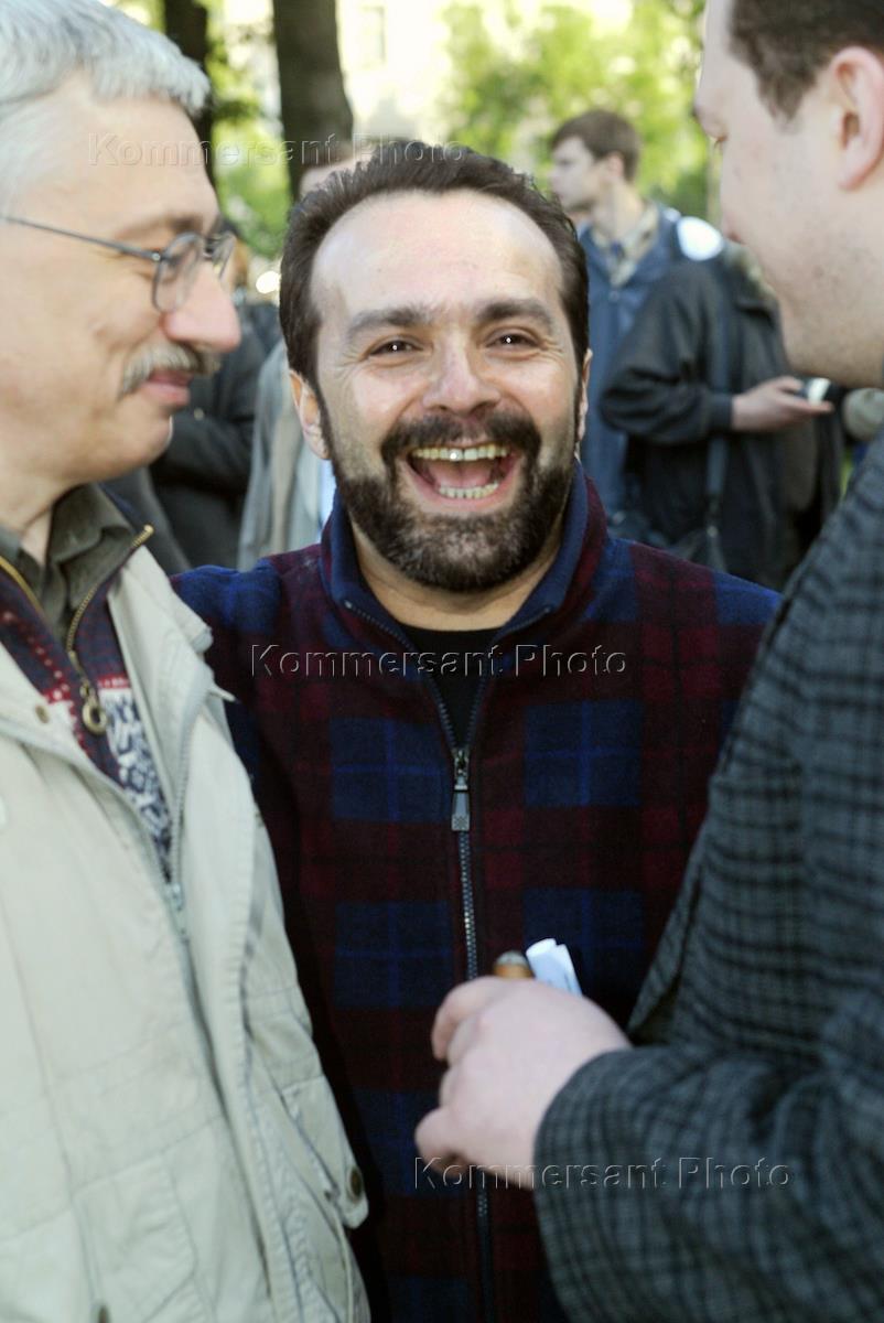 Писатель-сатирик, телеведущий Виктор Шендерович (слева) во время митинга в поддержку мирного урегулирования в Чечне. Митинг прошел на Пушкинской площади.