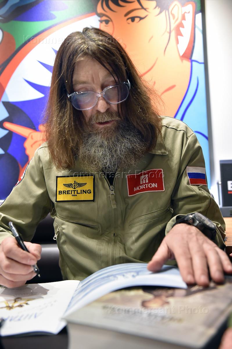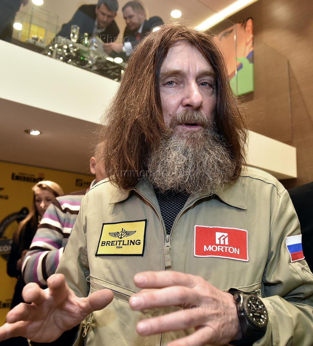 Церемония вручения часов Emergency Breitling путешественнику Федору Конюхову, который совершит кругосветное путешествие на воздушном шаре компании "Мортон", а Breitling станет официальным хронометристом кругосветного полета. Путешественник Федор Конюхов во время церемонии.