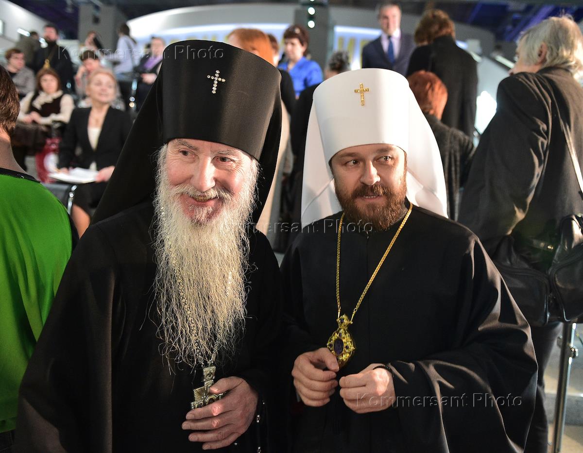 Председатель Отдела внешних церковных связей Московского Патриархата архиепископ Волоколамский Иларион (Алфеев) (слева) и митрополит Крутицкий и Коломенский Ювеналий (справа) во время заседания патриаршего совета по культуре, на ВВЦ.