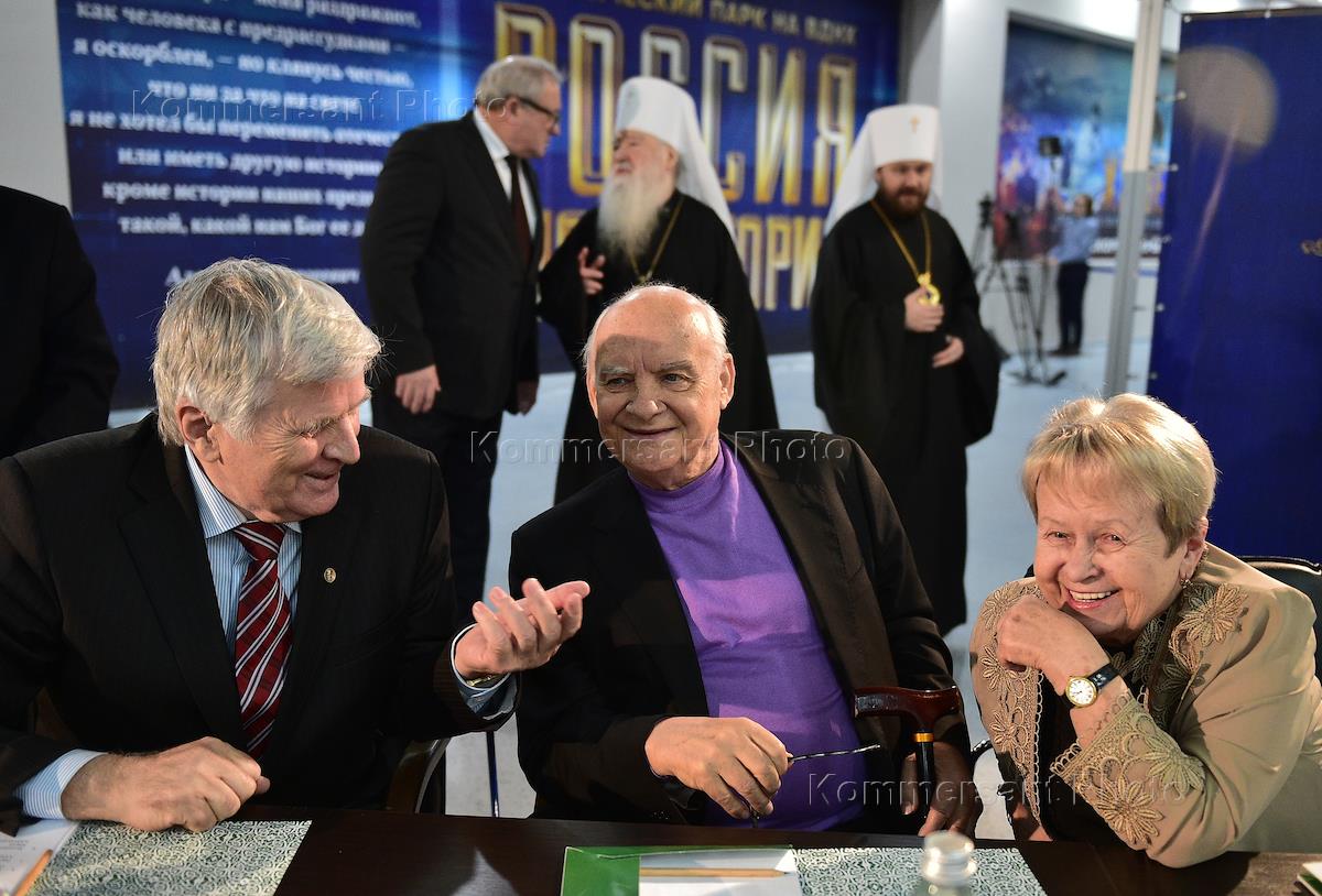 Заседание патриаршего совета по культуре прошло в 57 павильоне на ВДНХ. Слева направо: председатель Украинского общества охраны памятников истории и культуры, профессор, академик НАНУ, директор Института археологии НАН Украины Петр Толочко, поэт-песенник Николай Добронравов, композитор Александра Пахмутова перед началом заседания.