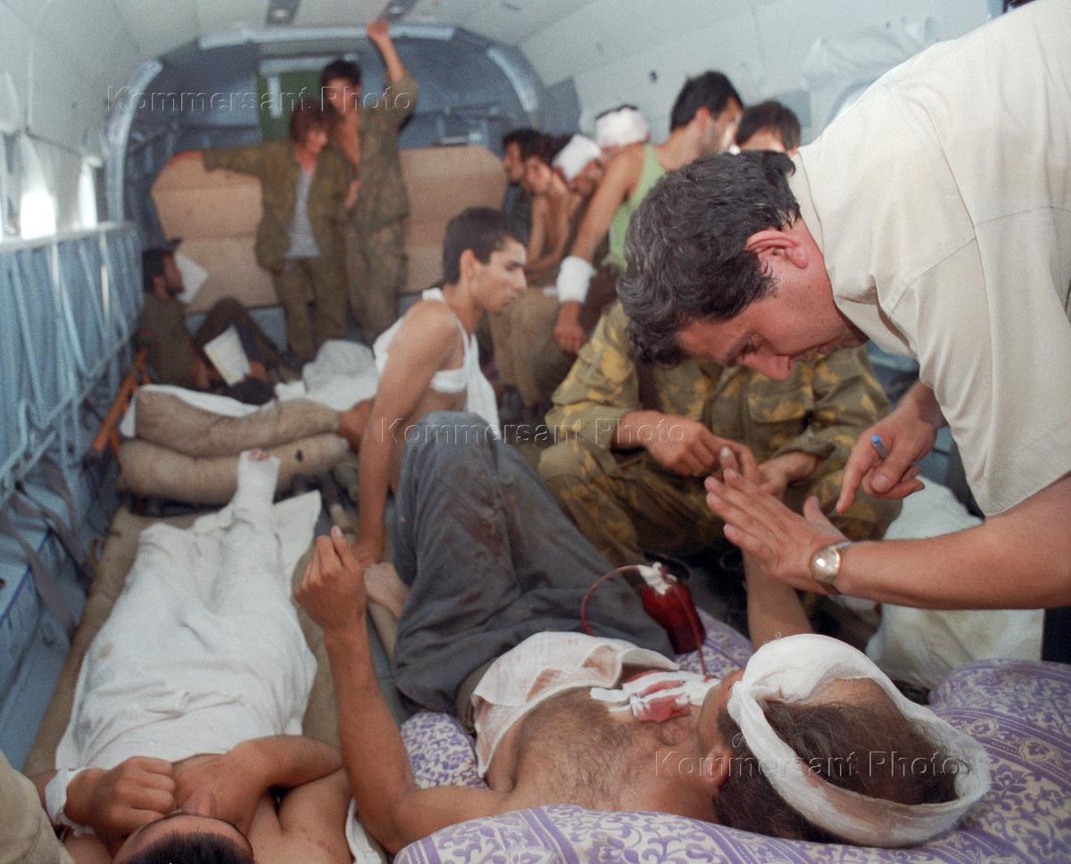 Вооруженный конфликт в Нагорном Карабахе. На вертолете перевозят раненных азербайджанцев в Баку.