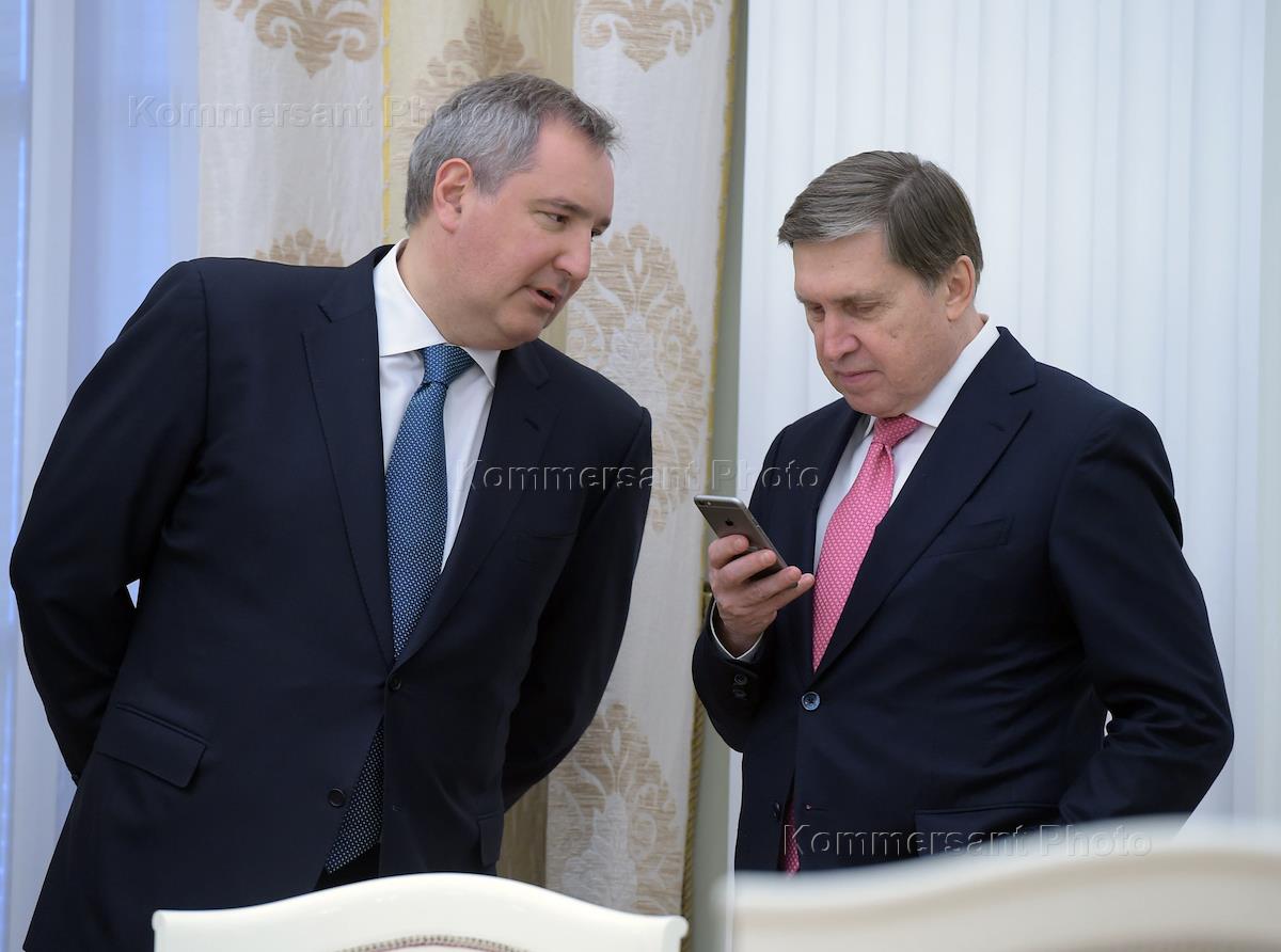 Заместитель председателя правительства России Дмитрий Рогозин (слева) и помощник президента России Юрий Ушаков (справа) во время встречи президента России Владимира Путина с президентом Сербии Томиславом Николичем. Встреча прошла в Кремле.