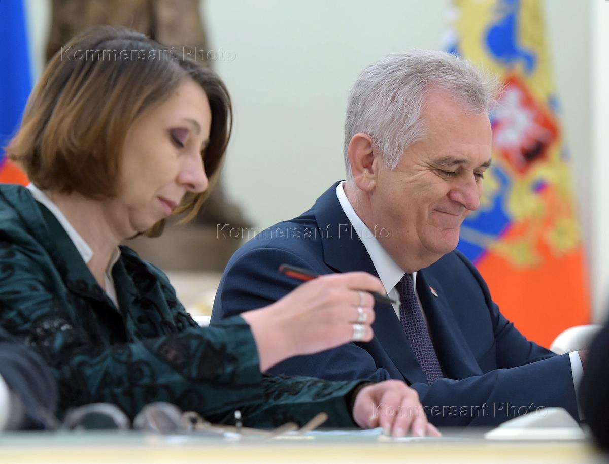 Президент России Владимир Путин (слева) и президент Сербии Томислав Николич (справа) во время встречи в Кремле.