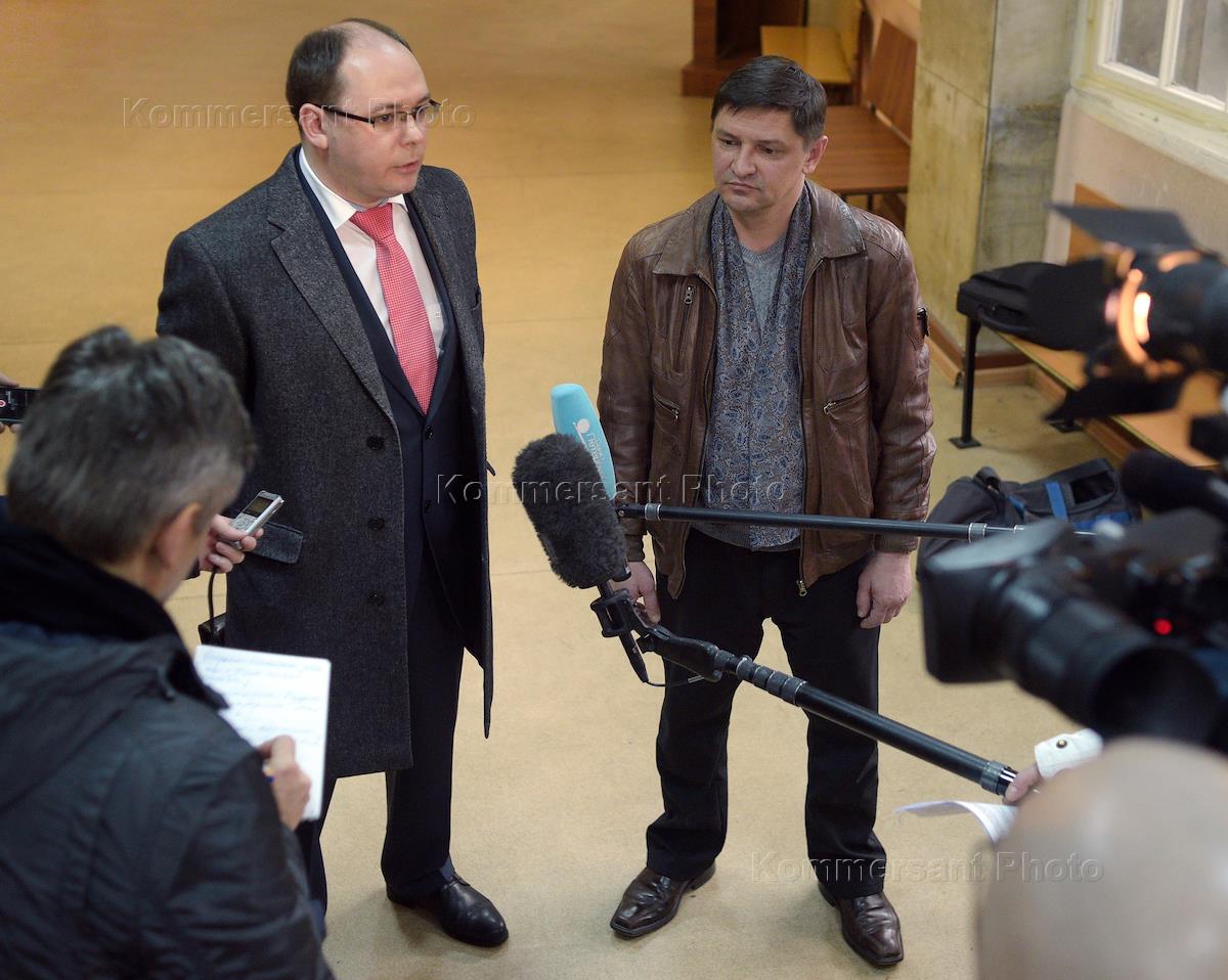 Обвиняемый по делу о покупки поддельных летных документов Андрей Манеев (справа) перед началом судебного разбирательства в Московском городском суде.