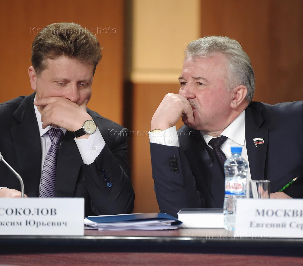 Russian President Vladimir Putin's business trip to Yaroslavl. Minister of transport of Russia Maxim Sokolov (left) and chairman of the transport committee of the Russian State Duma Yevgeny Moskvichev (right) are examining the exhibition 'Modern technlogies for the road-traffic safety' in the lobby of concert centre 'Millenium'.