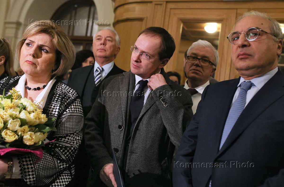 Министр культуры Республики Армения Асмик Погосян (слева), министр культуры России Владимир Мединский (в центре), директор Государственнго Исторического музея Алексей Левыкин (второй справа) и посол Армении в России Армен Смбатян (справа) на церемонии открытия выставки "Армения. Легенды бытия" в Государственном Историческом музее.