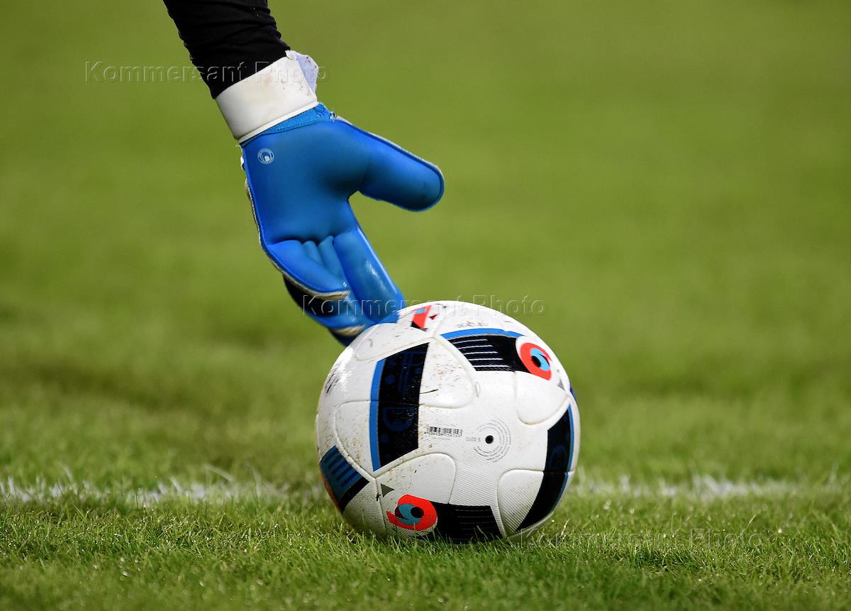 ROSGOSSTRAKH Russian Football Championship 2015/2016. The 20th round. The match between teams 'Dinamo' (Moscow) and 'Terek' (Grozny) at stadium 'Arena Khimki'. The scenic photograph. Goalkeeper's hand and ball at the field.