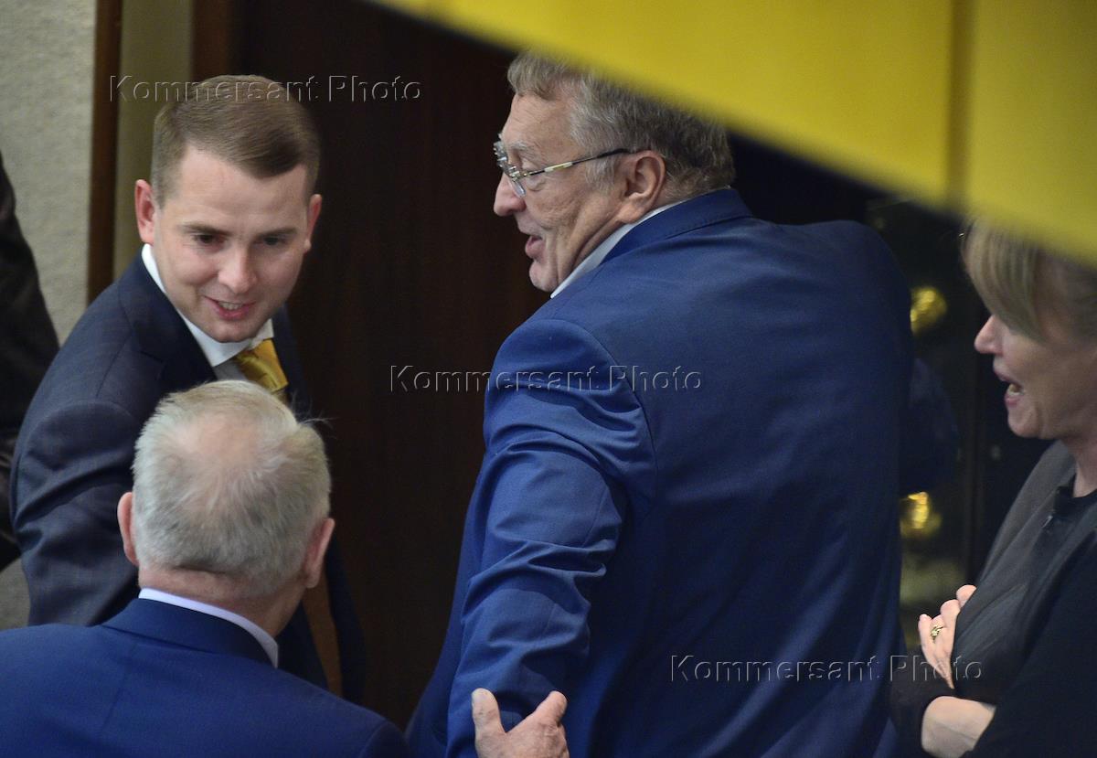 Председатель комитета Государственной думы (ГД) России по делам общественных объединений и религиозных организаций Ярослав Нилов (слева) и лидер Либерально-демократической партии России, член комитета ГД по обороне Владимир Жириновский (справа) на заседании Госдумы России.