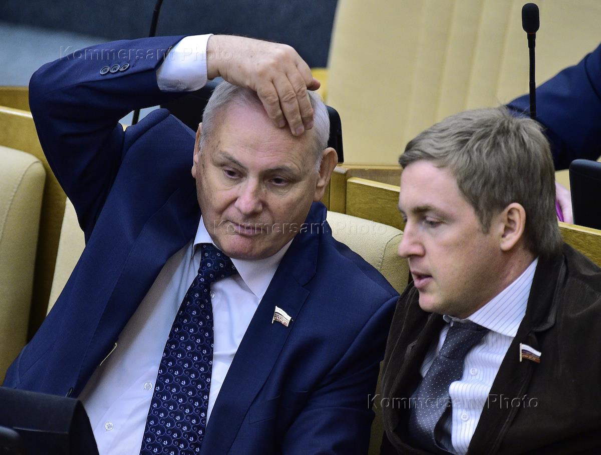 Член комитета Государственной думы России по природным ресурсам, природопользованию и экологии Cергей Вострецов (слева) на пленарном заседании Госдумы России.