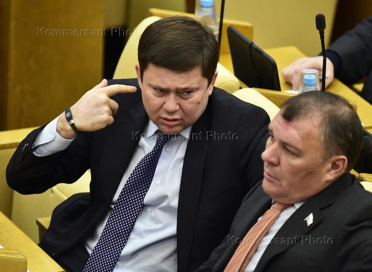 Член комитета Государственной думы (ГД) по экономической политике, инновационному развитию и предпринимательству Сергей Кривоносов (слева) и заместитель председателя комитета ГД России по гражданскому, уголовному, арбитражному и процессуальному законодательству Александр Ремезков (справа) на заседании Госдумы России.