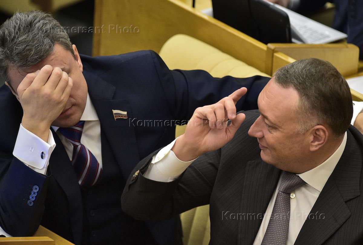 Member of the safety and anti-corruption committee of the Russian State Duma Boris Reznik (left) and member of the land matters and building committee of the State Duma Danil (right) are during the plenary sitting of the Russian State Duma.