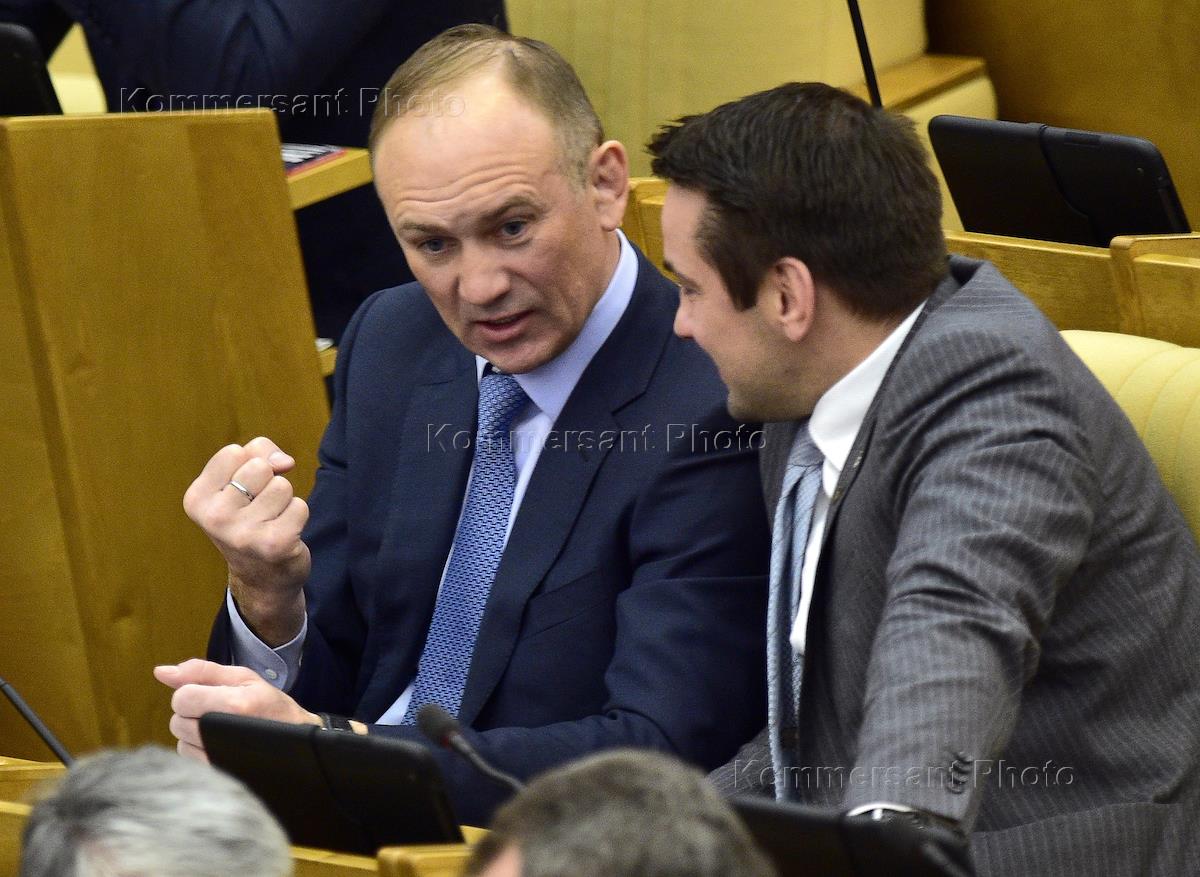 Member of the safety and anti-corruption committee of the Russian State Duma Boris Reznik (left) and member of the land matters and building committee of the State Duma Danil (right) are during the plenary sitting of the Russian State Duma.