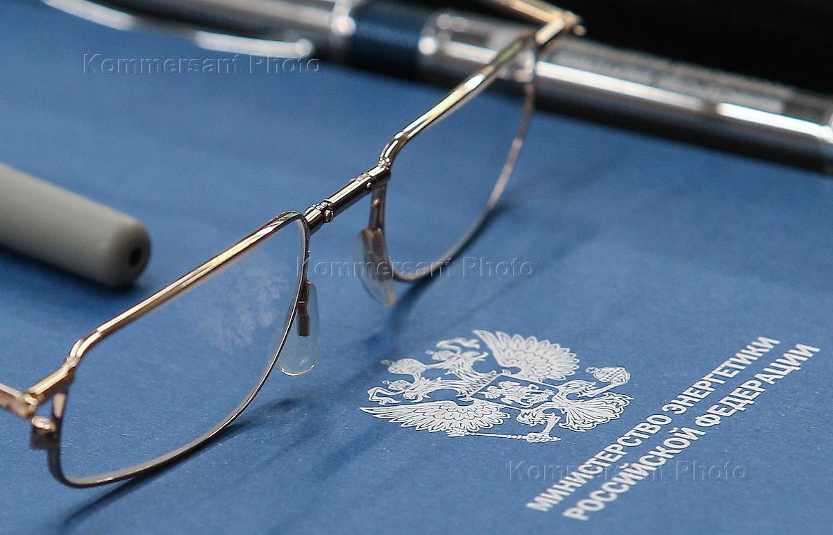Жанровая фотография. Заседание Общественного совета при министерстве энергетики России в Общественной палате России. Очки лежат на папке с надписью "Министерство энергетики России".