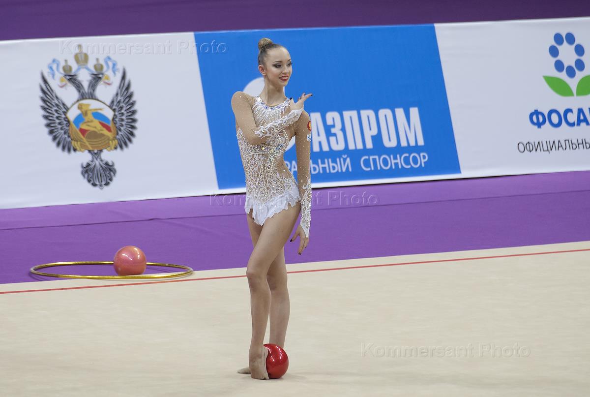 Russian gymnast Arina Averina is during the senior gymnasts competitions at Grand Prix 2016 in the Sports Complex Druzhba.