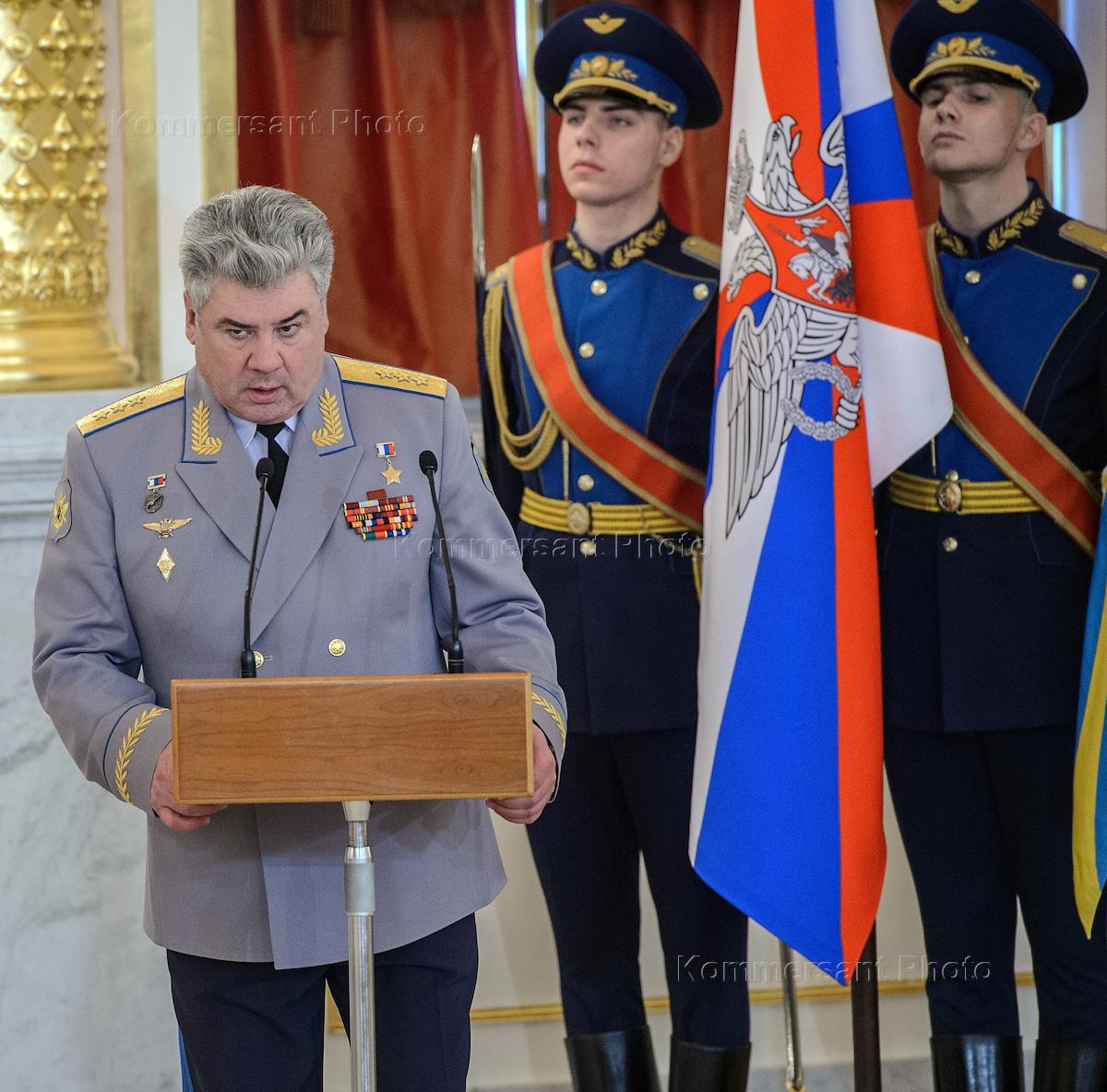 Главнокомандующий Воздушно-космических сил (ВКС) генерал-полковнику Виктор Бондарев во время церемонии вручения знамени Воздушно-космических сил. Церемония состоялась в Александровском зале Большого Кремлевского дворца.