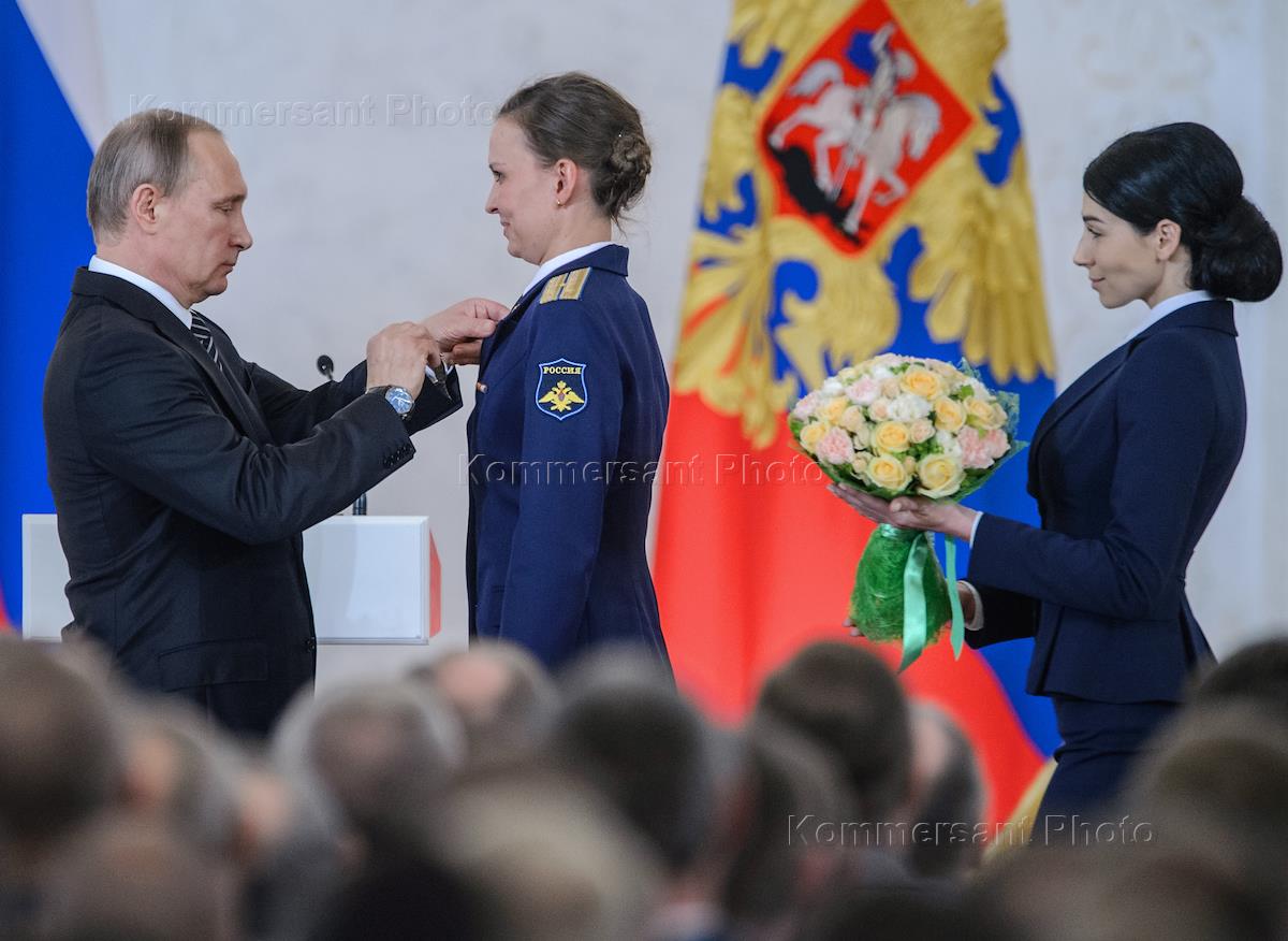 Президент России Владимир Путин (слева) и инженер отделения сигнализации 1073-го Центра управления ВКС старший лейтенант Елена Веселова (в центре) во время церемонии вручения государственных наград России военнослужащим и специалистам военно-промышленного комплекса, отличившимся в ходе выполнения специальных задач в Сирийской Арабской Республике. Церемония прошла в Георгиевском зале Большого Кремлевского дворца.