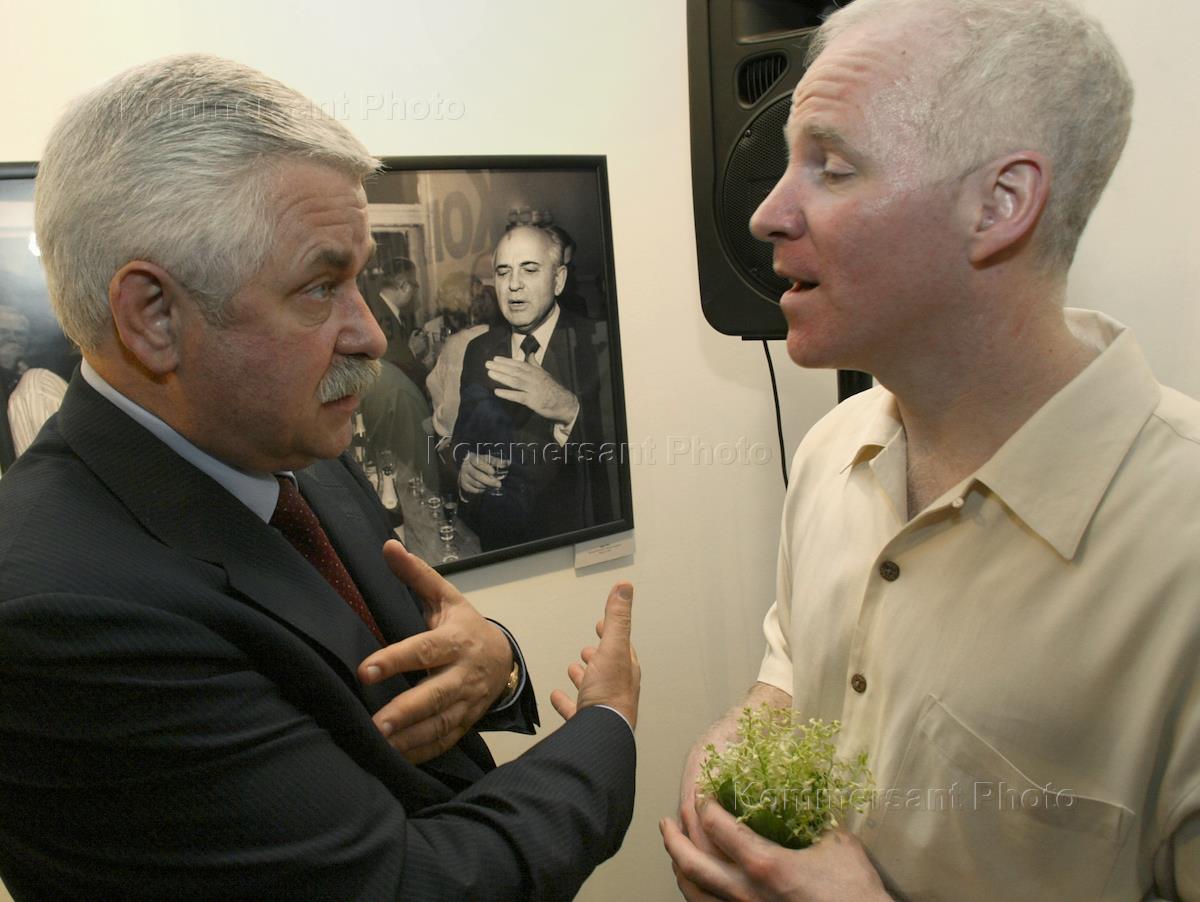 Former Russian vice-president turned leader of a failed coup attempt turned Kursk Oblast governor Alexander Rutskoy (left) talks to the Kommersant Publishing House Photo Service Director Eddie Opp (right) at the exhibition of the latter's photo-works headlined 'Eddie Opp. A Look from Outside'. The exhibition was staged in the Moscow Photgraphy House.