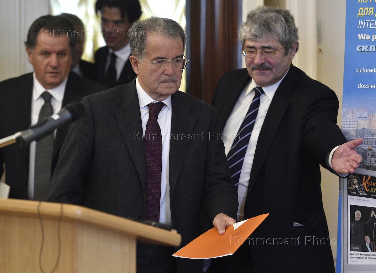 Former Prime-Minister of Italy, former chairman of the European Commission Romano Prodi (in the centre) is before his lecture during course 'Golden collection', which is conducted by magazine 'International life' with the support from the Ministry of foreign affairs of the Russian Federation. The lecture held in the residence of the Ministry of foreign affairs of Russia.