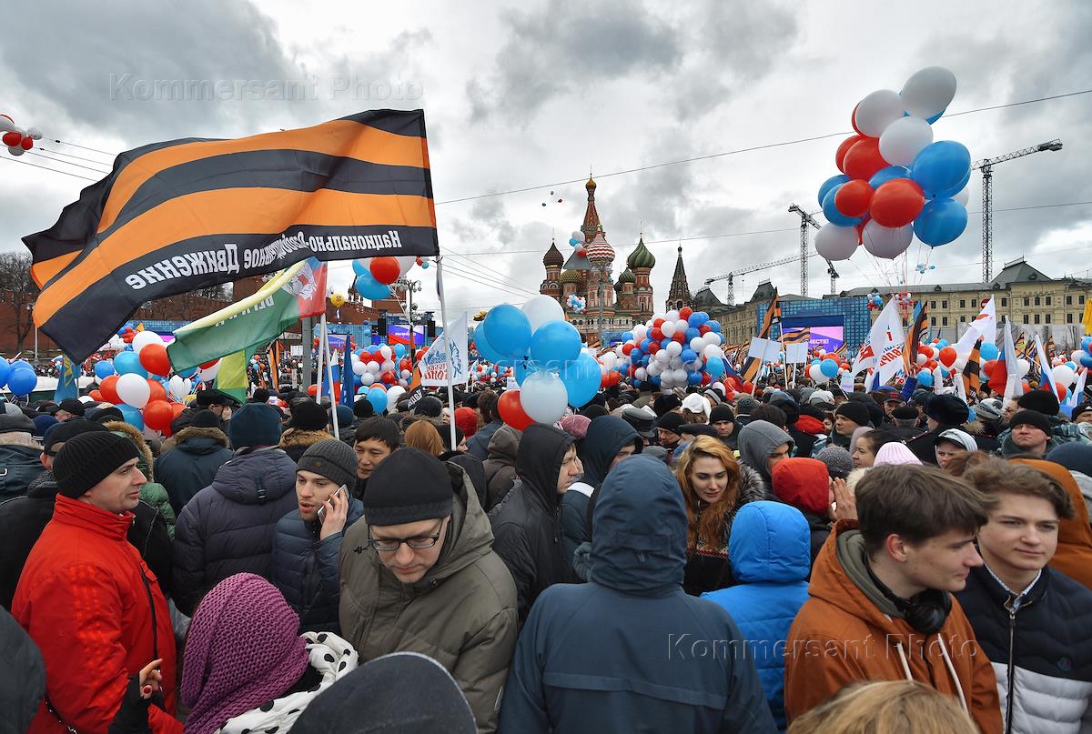 Participants of the 'We are together' festive mass-meeting and the concert, devoted to the anniversary of the integration of Crimea and Russia. The celebration held at the Vasilievsky Slope.