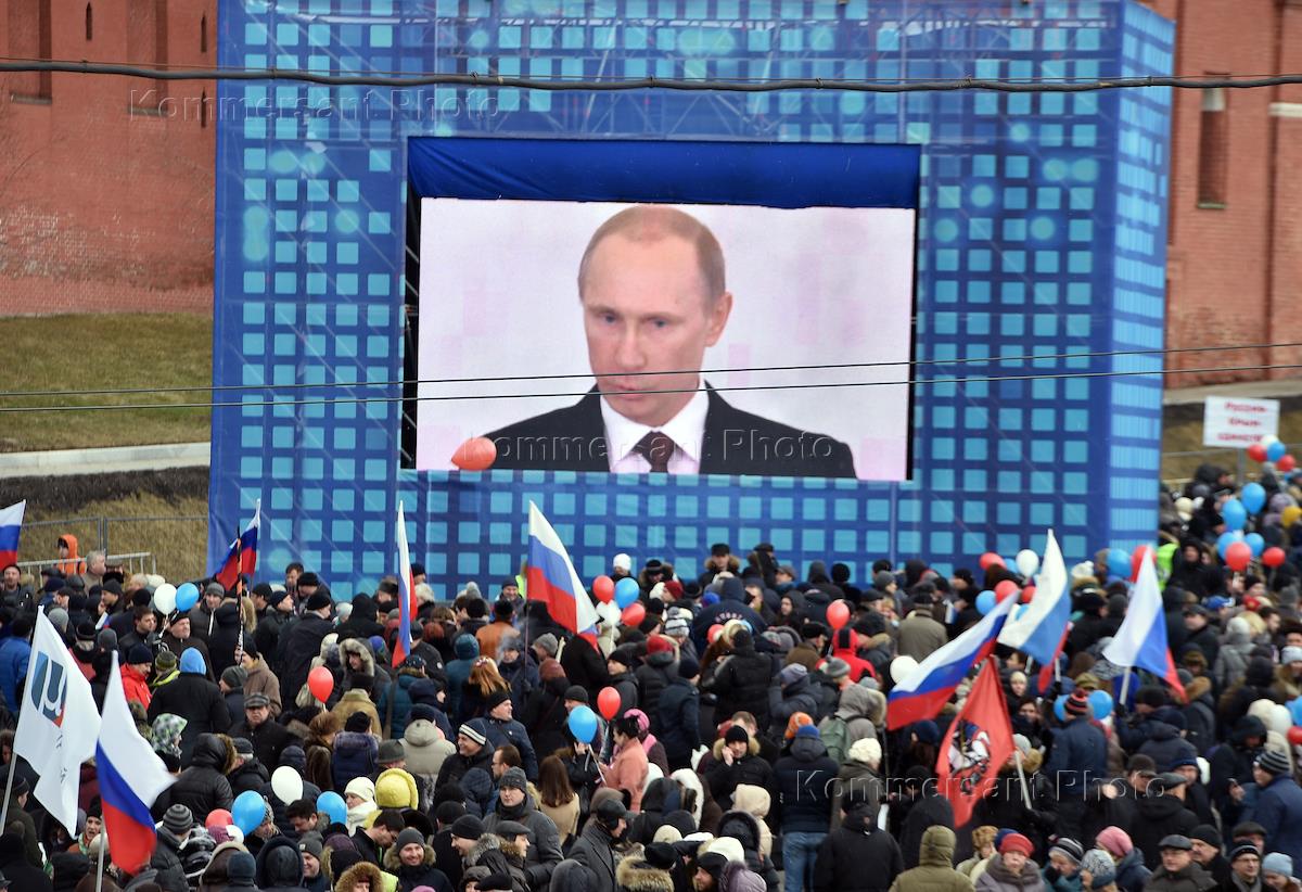 Participants of the 'We are together' festive mass-meeting and the concert, devoted to the anniversary of the integration of Crimea and Russia. The celebration held at the Vasilievsky Slope.