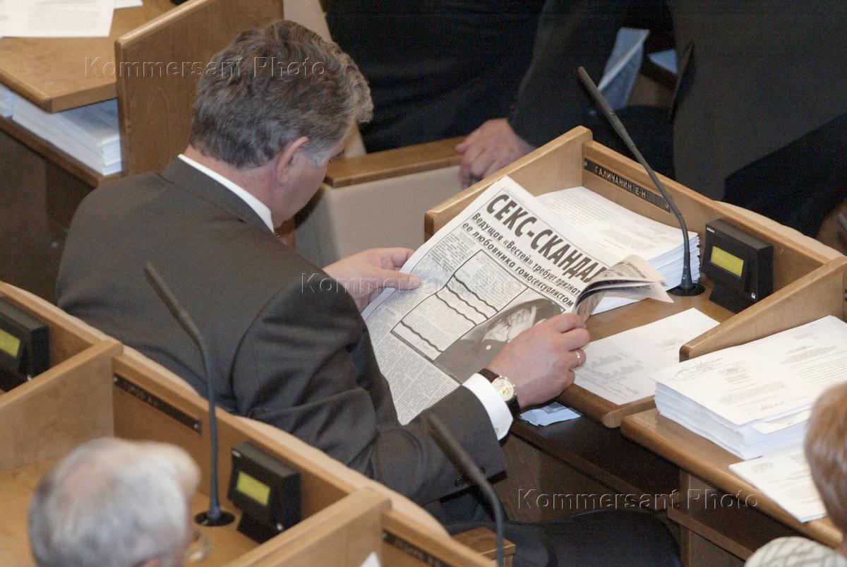 Депутат читает газету на пленарном заседании Государственной Думы России.