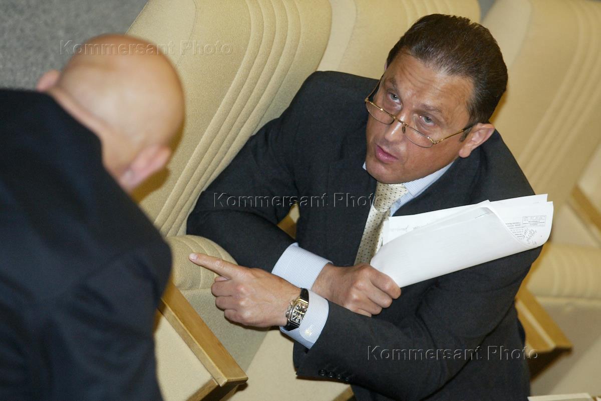 Заместитель председателя Комитета Государственной Думы по бюджету и налогам Михаил Задорнов (слева) и член фракции СПС, председатель Комитета Государственной Думы России по законодательству Павел Крашенинников (справа) на пленарном думском заседании.