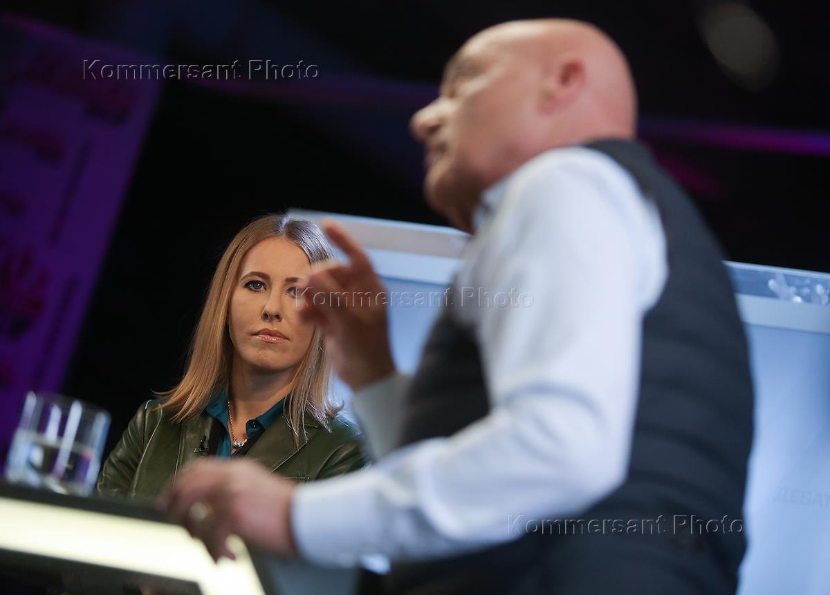 Дебаты с участием политика Алексея Навального и телеведущего Владимира Познера прошли в прямом эфире телеканал "Дождь". Телеведущая, главный редактор русской версии журнала L'Officiel Ксения Собчак (слева) и телеведущий Владимир Познер (справа) во время дебатов.
