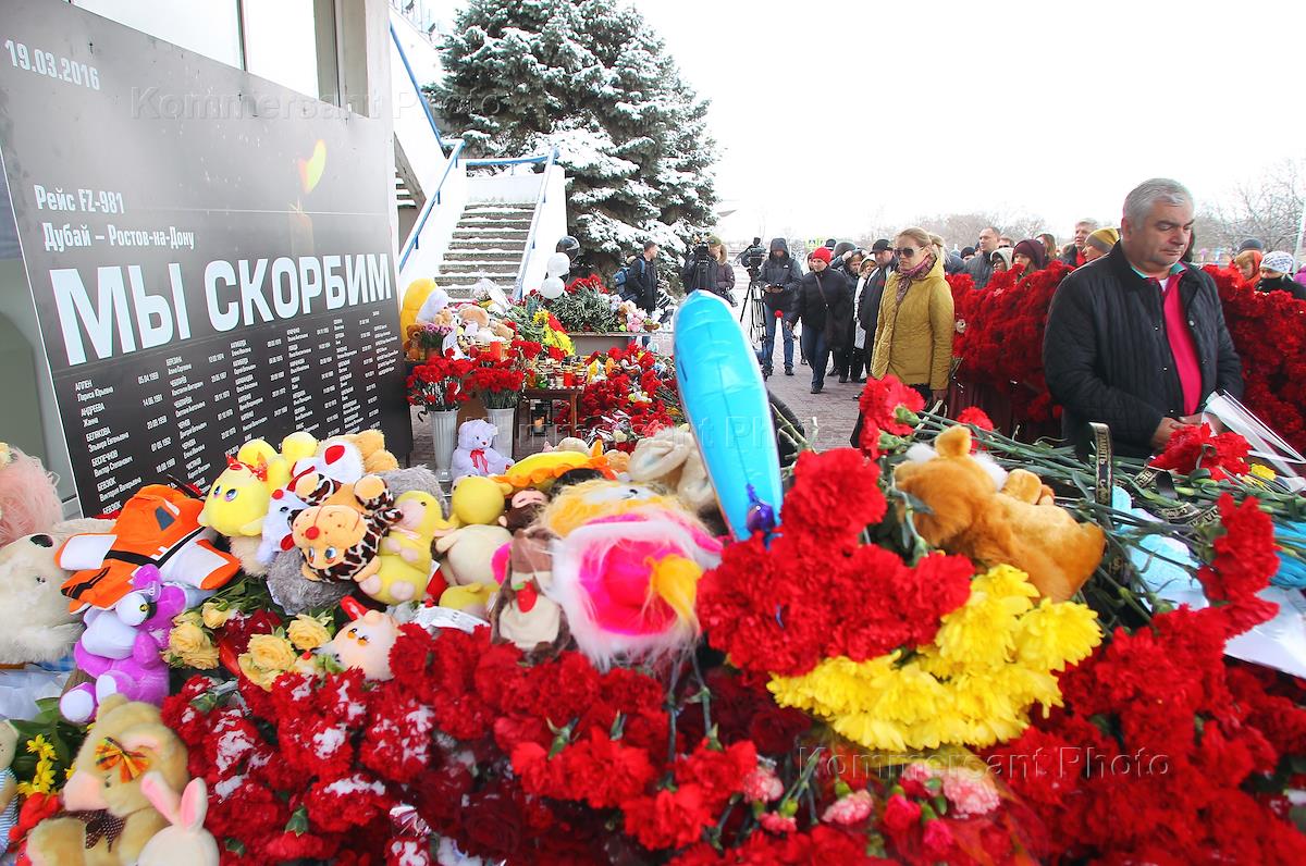 Цветы у здания аэропорта Ростова-на-Дону, где потерпел крушение самолет Boeing 737 авиакомпании Flydubai, выполнявшего рейс FZ981 по маршруту "Дубай - Ростов-на-Дону". В авиакатастрофе погибли 55 пассажиров и 7 членов экипижа.
