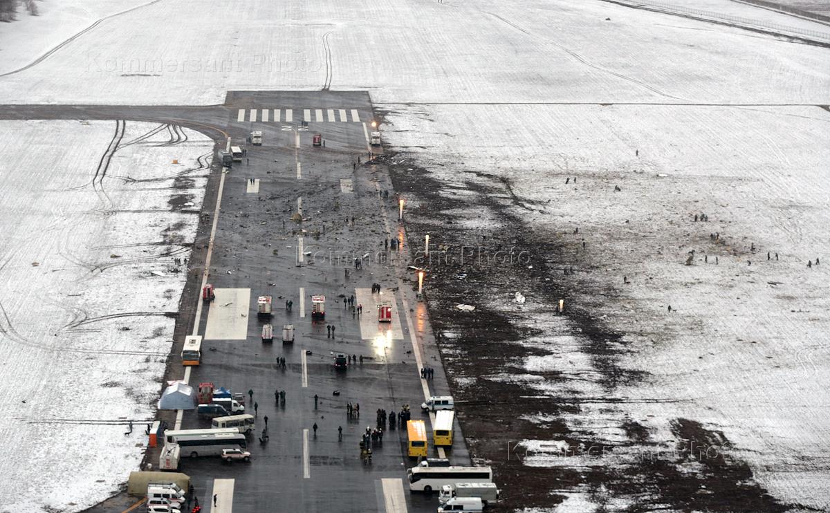 Сотрудники правоохранительных органов и МЧС России работают на месте крушения самолета Boeing 737 авиакомпании Flydubai, выполнявшего рейс FZ981 по маршруту "Дубай - Ростов-на-Дону", в аэропорту Ростова-на-Дону. В авиакатастрофе погибли 55 пассажиров и 7 членов экипижа.