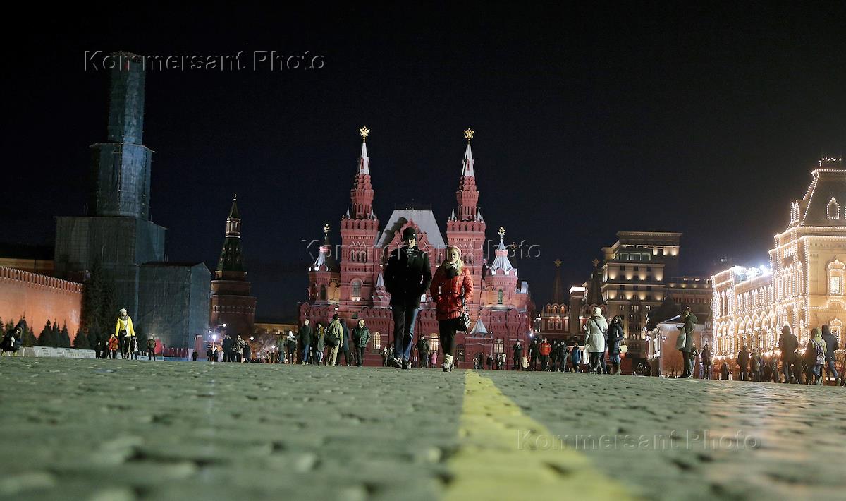 Вид на Государственной Исторический музей и Кремль после отключения подсветки в рамках проведения экологической акции "Час Земли" в Москве.