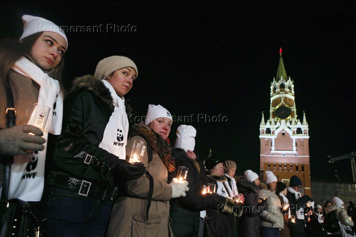Поведение экологической акции "Час Земли" на Красной площади в Москве. Активисты Всемирного фонда дикой природы (WWF) со свечами в руках скорбят о погибших пассажирах самолета Boeing 737 авиакомпании Flydubai, выполнявшего рейс FZ981 по маршруту "Дубай - Ростов-на-Дону". Самолет потерпел крушение в аэропорту Ростова-на-Дону. В авиакатастрофе погибли 55 пассажиров и 7 членов экипижа.
