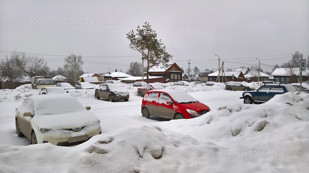 Виды Перми. Заснеженные припаркованные автомобили на улице города.