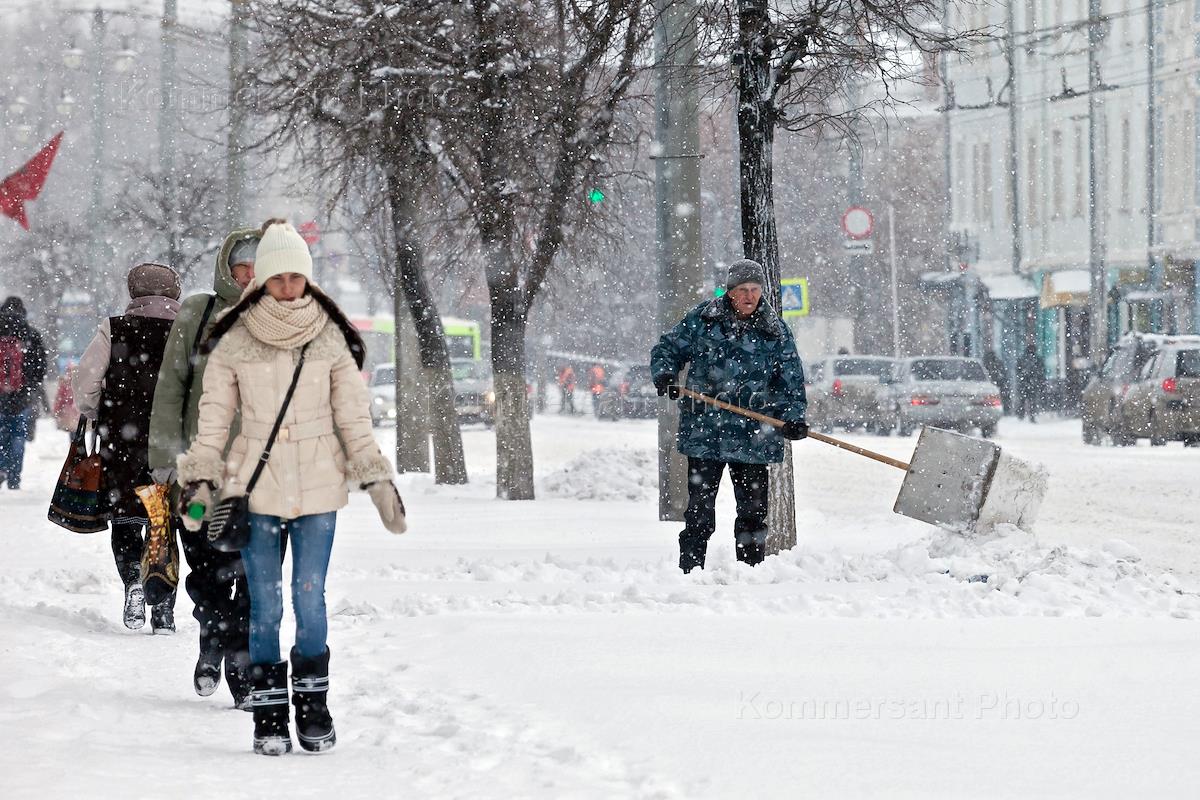 Жанровая фотография. Снегопад во Владимире. Дворник убирает снег.