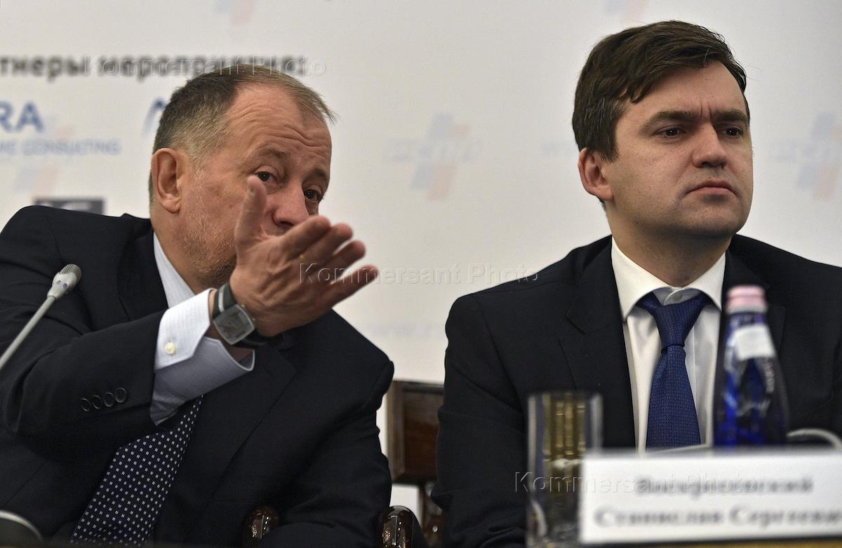 IX Неделя российского бизнеса. Мероприятия недели прошли в отеле The Ritz-Carlton. Председатель Комитета Российского союза промышленников и предпринимателей (РСПП) по налоговой политике, председатель совета директоров ПАО "Новолипецкий металлургический комбинат" Владимир Лисин (слева) и заместитель министра экономического развития России Станислав Воскресенский (справа) во время налогового форума "Фискальная нагрузка на российскую экономику: налоговая и неналоговые составляющие".
