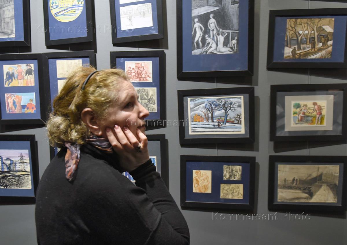 Посетитель на церемонии открытия выставка художника Владимира Шагина (1932 - 1999), одного из художников "арефьевского круга" в художественной галерее KGallery.