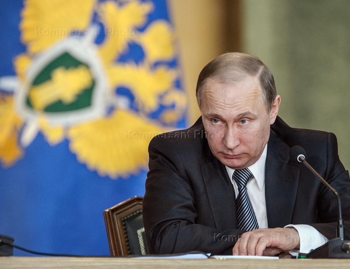 President of Russia Vladimir Putin is during the extended meeting of the board of the General Prosecutor Office of Russia.