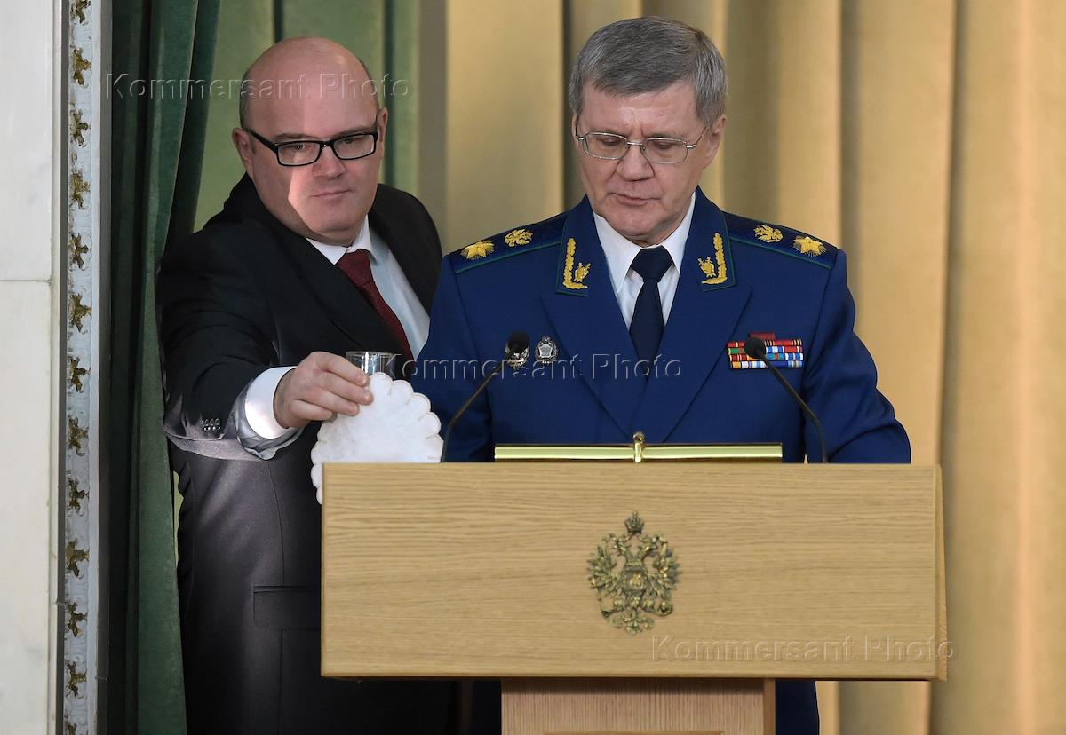 Prosecutor-General of Russia Yury Chayka (right) is during the extended meeting of the board of the General Prosecutor Office of Russia.