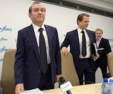 Руководитель департамента транспорта и развития дорожно-транспортной инфраструктуры города Москвы Максим Ликсутов (слева) и художественный руководитель Государственного театра наций Евгений Миронов (в центре) во время пресс-конференции "Городская программа "Моя улица": новый облик любимого города", в "Интерфаксе".