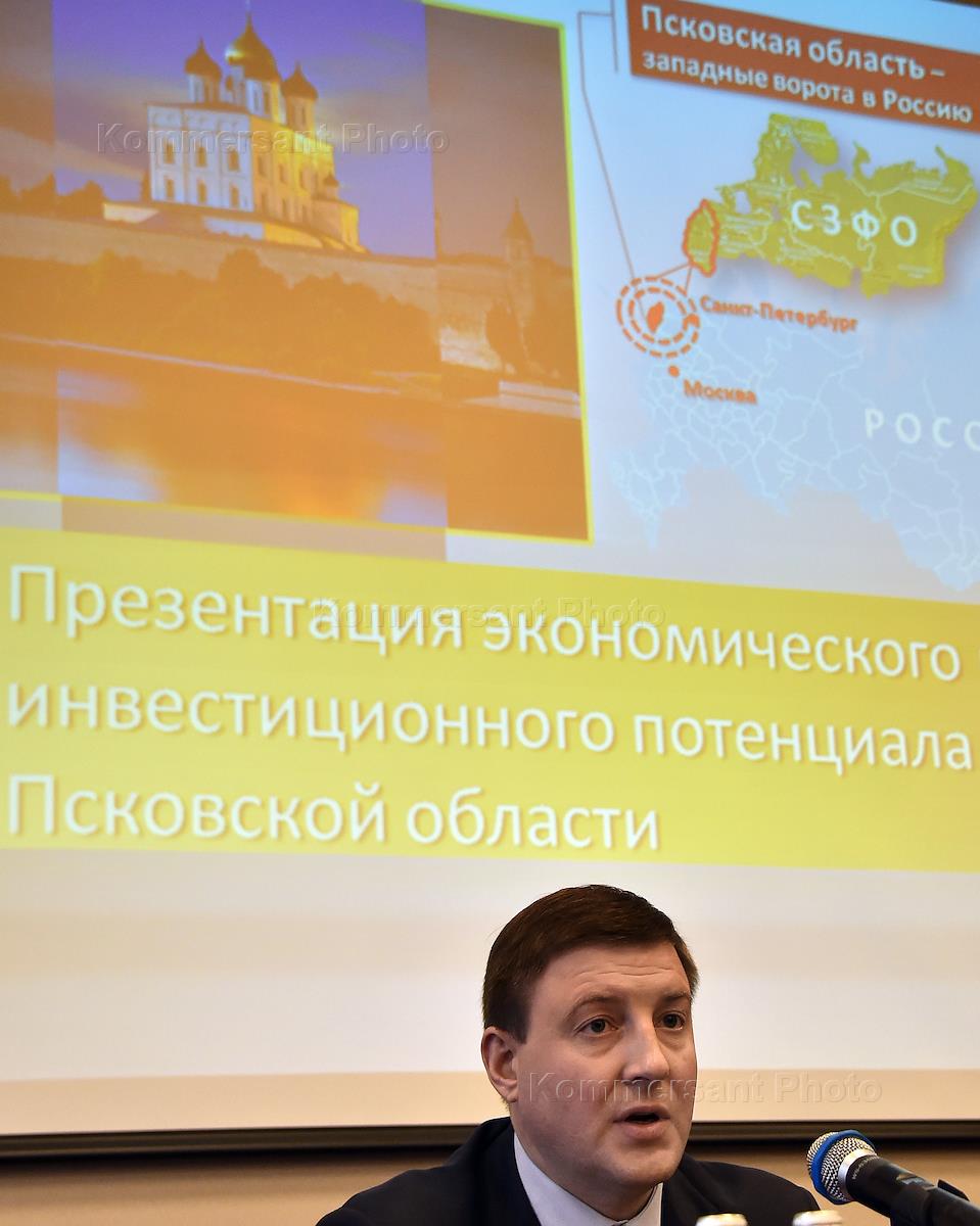 IX Неделя российского бизнеса. Руководитель регионального отделения Российского союза промышленников и предпринимателей (РСПП) Псковской области Александр Козловский во время презентации экономического и инвестиционного потенциала Псковской области.