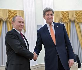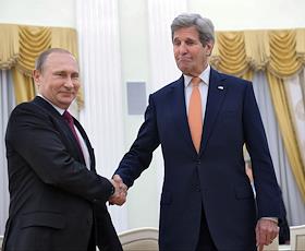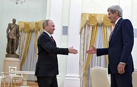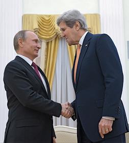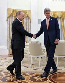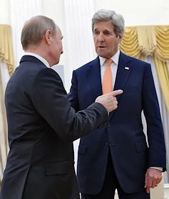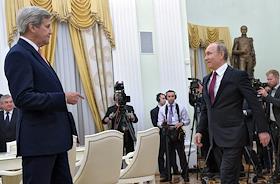 The meeting of the President of Russia Vladimir Putin and State secretary of the USA John Kerry held in the Kremlin. President of Russia Vladimir Putin (left) and State secretary of the USA John Kerry (right) are during the meeting.