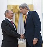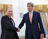 The meeting of the President of Russia Vladimir Putin and State secretary of the USA John Kerry held in the Kremlin. State secretary of the USA John Kerry (left) and President of Russia Vladimir Putin (right) are during the meeting.