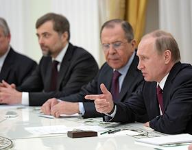 The meeting of the President of Russia Vladimir Putin and State secretary of the USA John Kerry held in the Kremlin. Assistant of the President of Russia Vladislav Surkov, Minister of foreign affairs of Russia Sergey Lavrov and President of Russia Vladimir Putin (from left to right).