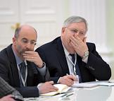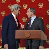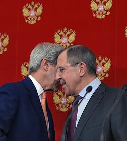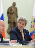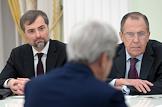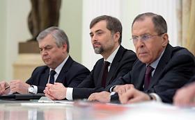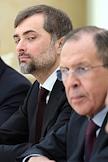The meeting of the President of Russia Vladimir Putin and State secretary of the USA John Kerry held in the Kremlin. Assistant of the President of Russia Vladislav Surkov (in the centre) and Minister of foreign affairs of Russia Sergey Lavrov (right) are during the meeting.