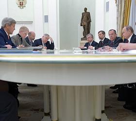 The meeting of the President of Russia Vladimir Putin and State secretary of the USA John Kerry held in the Kremlin. State secretary of the USA John Kerry (left), embassador of the USA in Russia John Tefft 9the fourth from left), assistant of the President of Russia Vladislav Surkov (the third from right), Minister of foreign affairs of Russia Sergey Lavrov (the second from right) and President of Russia Vladimir Putin (right) are during the meeting.