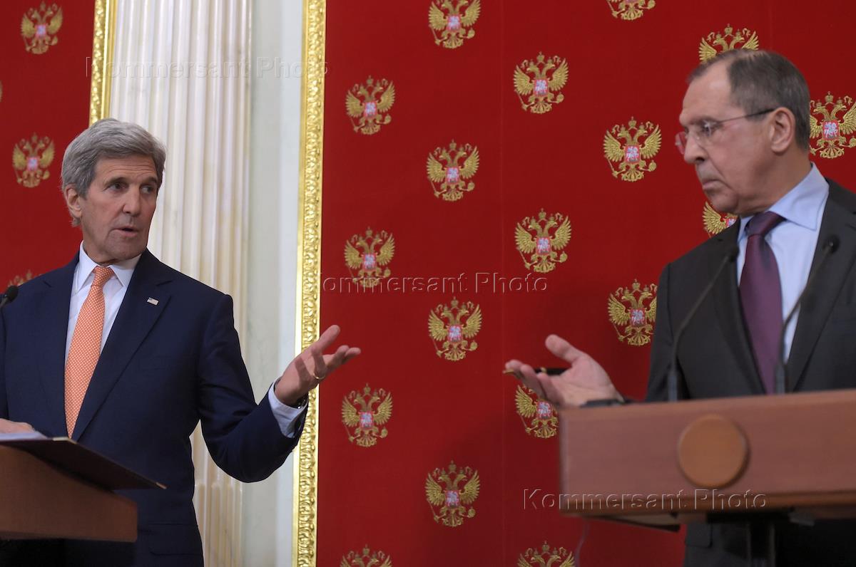 Встреча президента России Владимира Путина с государственным секретарем Соединенных Штатов Америки (США) Джоном Керри прошла в Кремле. Государственный секретарь США Джон Керри (слева) и министр иностранных дел России Сергей Лавров (справа) перед началом встречи.
