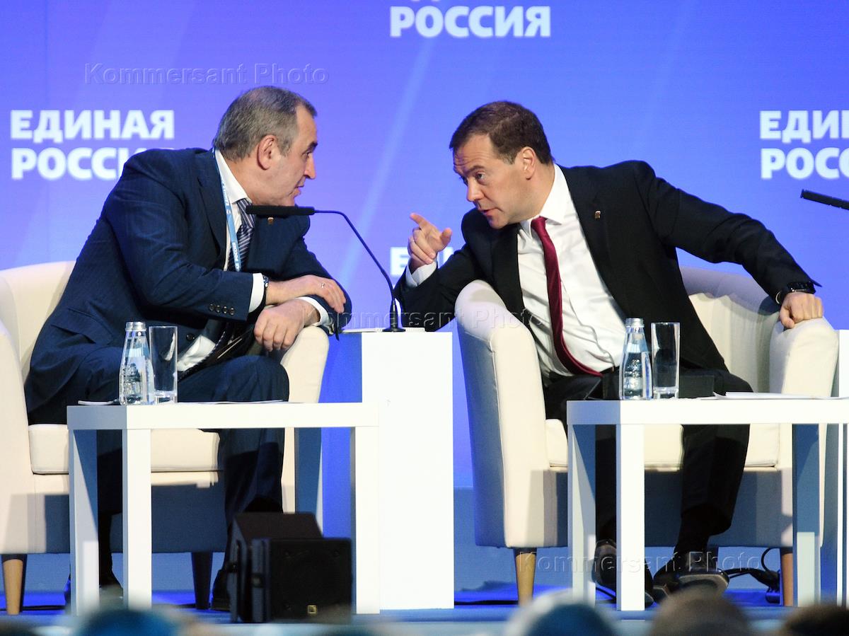 Секретарь Генерального совета партии "Единая Россия" Сергей Неверов (слева) и председатель правительства России Дмитрий Медведев (справа) на форуме "Эффективная социальная политика: новые решения" Всероссийской политической партии "Единая Россия" в Санкт-Петербурге.