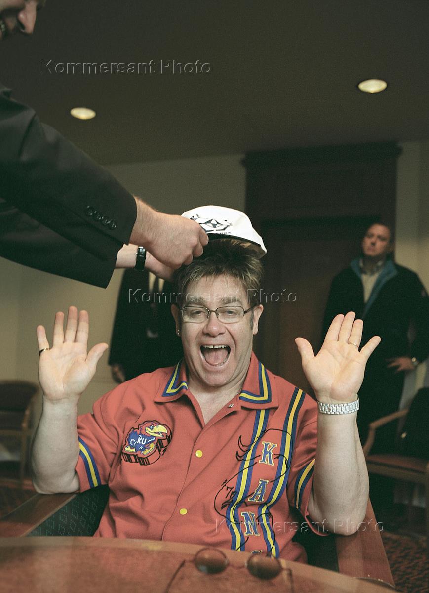 British pianist, singer and composer Elton John receives an exclusive ring from the jewellery company "Cristall" at the "Baltschug" hotel.