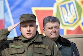 День Национальной гвардии Украины. Мероприятиях по случаю второй годовщины создания Национальной гвардии Украины (НГУ) прошли в учебном центре НГУ в селе Новые Петровцы. секретарь Совета национальной безопасности и обороны Украины Александр Турчинов (второй слева) и президент Украины Петр Порошенко (в центре) во время посещения учебного центра НГУ.